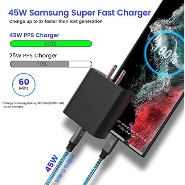 【One Fits All】- This portable 45W USB-C Charger pack is broadly compatible with almost any personal devices from phones, tablets to laptops, and especially, provides optimized charging for Samsung, [45W Super Fast Charging 2.0]: Samsung Galaxy S22 Ultra/S22 Plus/S20 Ultra/Note 10 Plus, Galaxy Tab S8/Ultra/S7/Plus; [25W Super Fast Charging 1.0]: Samsung Galaxy S23/S22/S21/S21+/S21 Ultra/FE 5G/S20/S20+/Note 20 Ultra/A71/Z Fold 4/Z Flip 4; [PD Fast Charging]: MacBook Air, iPad, iPhone, Switch…