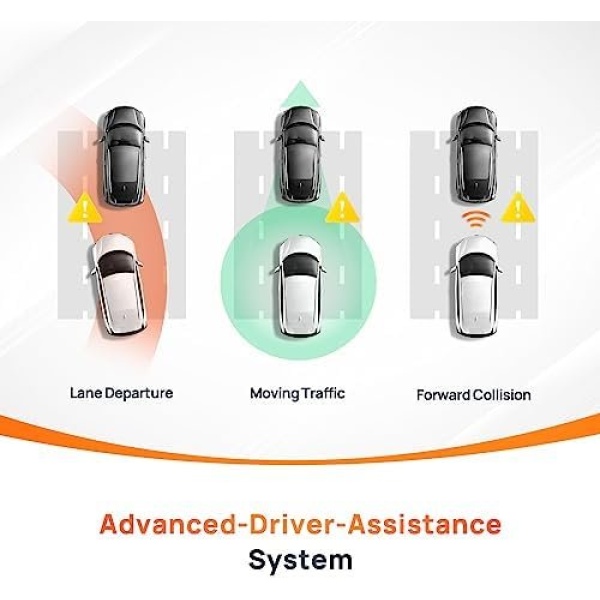 【ADAS System Featured Dash Cam】The Advanced Driving-Assistance System (ADAS) detects your surroundings and has real-time voice alerts to warn you of safety problems. The camera automatically detects lane markings and gives voice alerts when the car is drifting out of the lane. The dash cam also identifies the vehicle ahead and calculates the speed and distance of the car in front to prevent forward collisions while driving