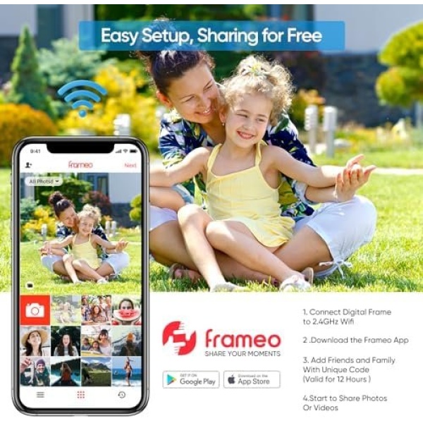 【Wifi Smart Picture Frame】: Connect the electronic picture frame to WiFi network , download the Free FRAMEO app on the phone. then you can privately and safely share photos or videos with family from anywhere and anytime. Built-in 32GB memory and allows to insert SD card(max. 128G, not included), enabling you to read files and export, and back up the received photos and videos for better album management.