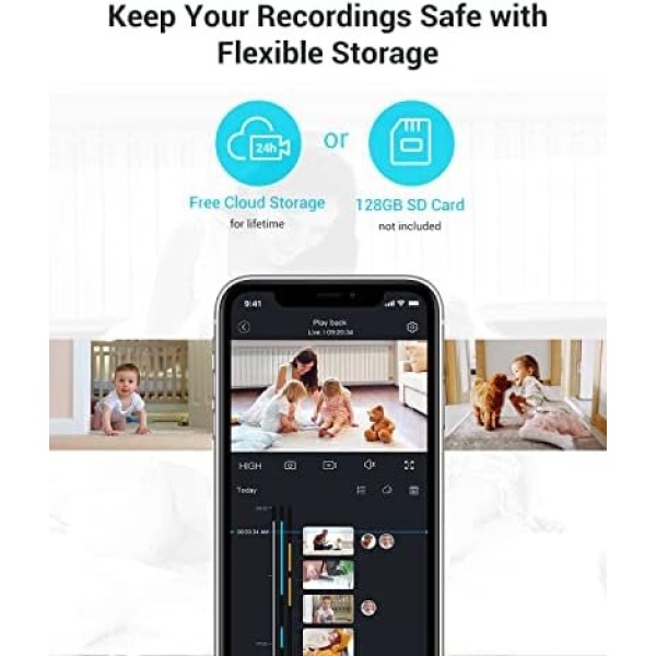 Optional Cloud & Local Storage – 24/7 CVR enables the indoor security camera to keep a nonstop recording in the cloud, avoid the risk of losing video footage from a SD card. According to the time, events type or the camera name’s to search the specific event quickly. Supports up to 128GB SD card(buy separately).
