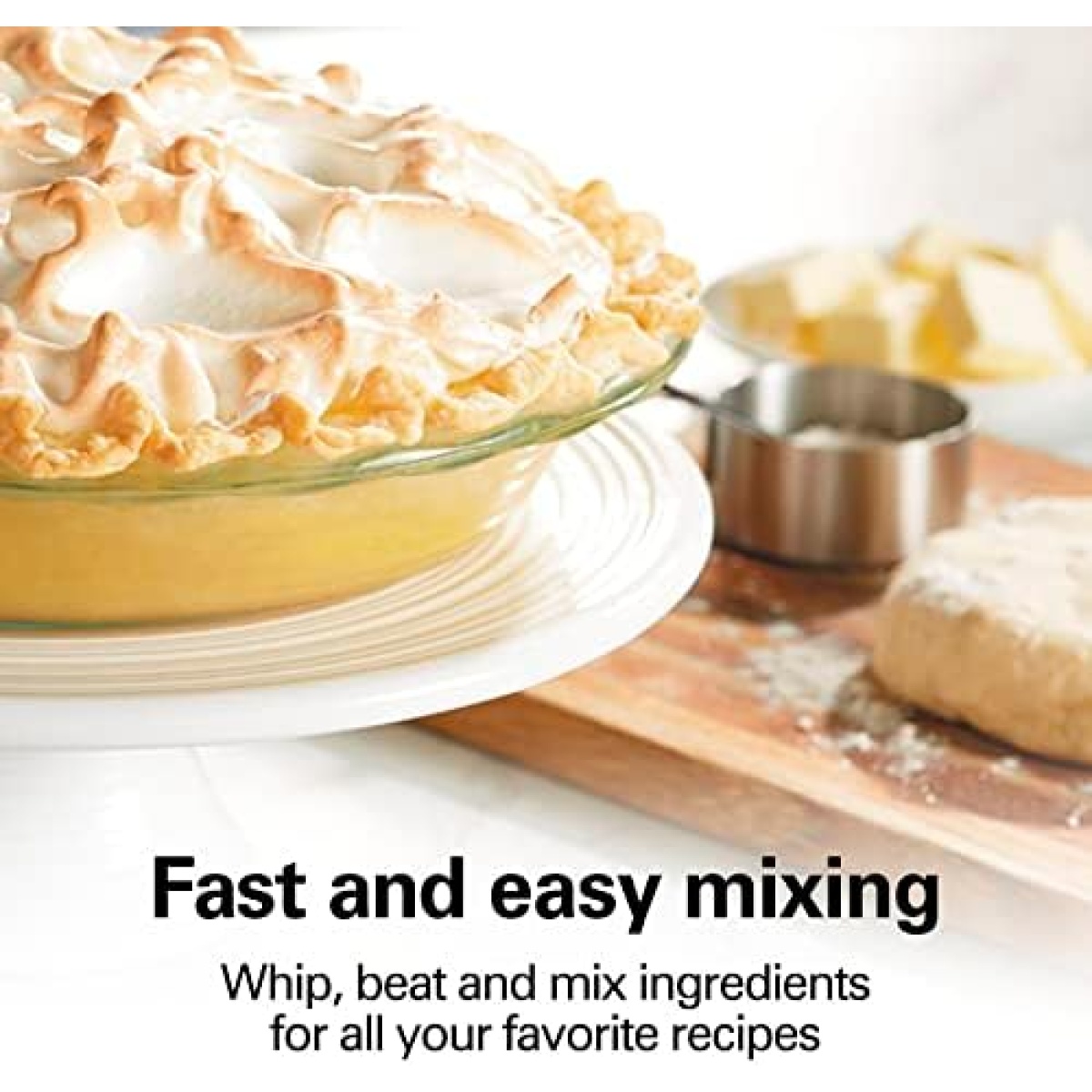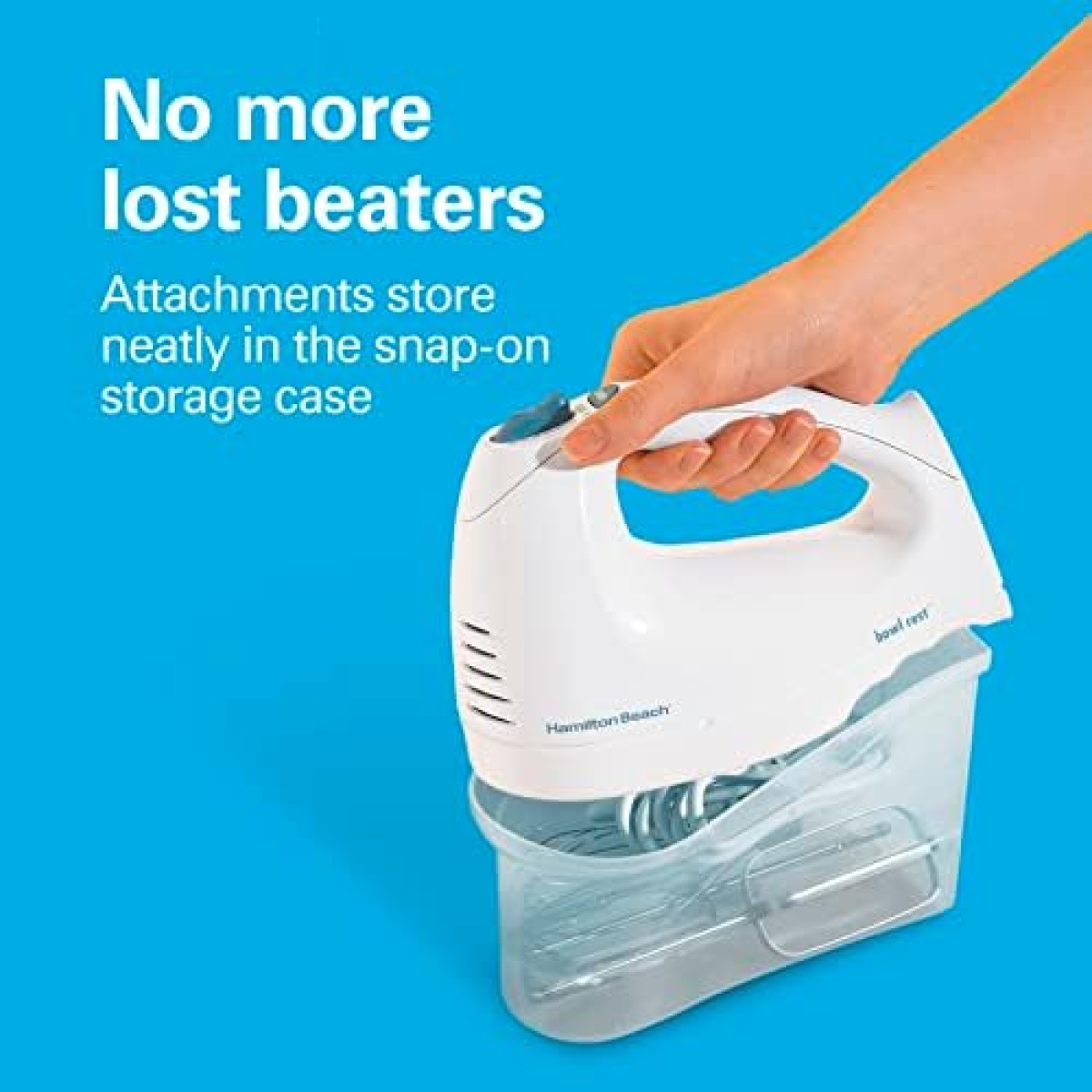 Whip up an airy meringue or decadent cake with the Hamilton Beach hand mixer. This versatile mixer is your go-to appliance for mixing, whisking, and folding with 250W of peak power. A built-in bowl rest makes it easier to set the mixer down when adding ingredients. The mixer has six speeds, including quick burst functions for additional power at any speed. The Hamilton Beach hand mixer is not just about performance, it’s also designed for easy storage. A convenient snap-on case keeps attachments together, so you don’t have to search for them each time you need them. Includes traditional beaters and whisk.Snap-On Storage Case No more digging through the drawers to find your mixer attachments. A storage case perfectly fits all the attachments and cord. It then snaps onto the mixer, keeping everything together in one place.Snap-On Storage Case: No more digging through the drawers to find your mixer attachments. A storage case perfectly fits all the attachments and cord. It then snaps onto the mixer, keeping everything together in one place.