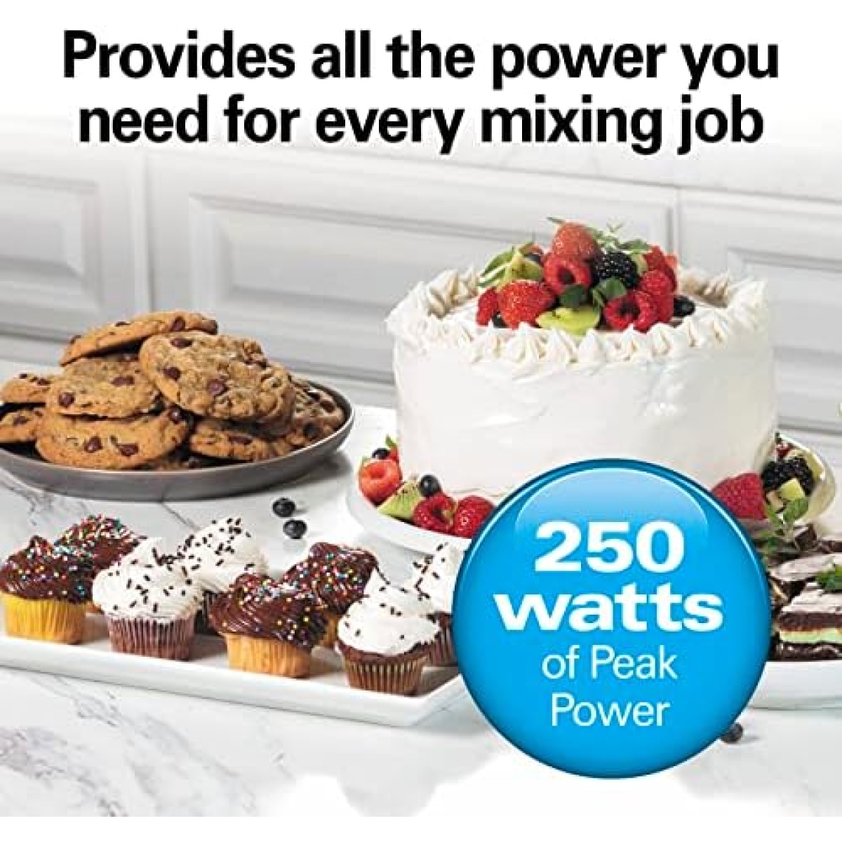 250 watts of peak power. This Hamilton Beach hand mixer provides all the power you need for every mixing job, whether you’re adding nuts and chocolate chips to cookie dough or making fluffy whipped cream.