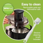 EASY TO CLEAN: Cleaning up after you juice is easy. The juice extractor comes with a convenient strainer cleaning brush, and the pulp bin, juice bowl, lid and pusher are all dishwasher safe.