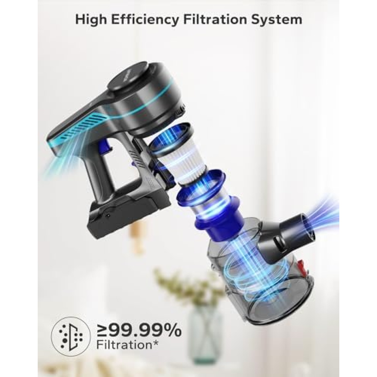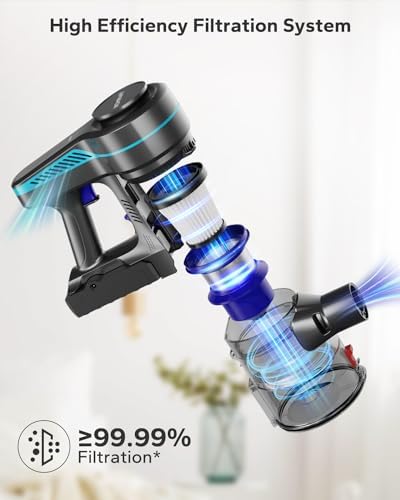 ✅[Filters out 99.99% of Fine Dust Particles] H18 cordless stick Vacuum’s breakthrough Double-Cyclone Filtration System ensures that 99.99% of microscopic dust particles are filtered out, providing you and your family with fresh air.