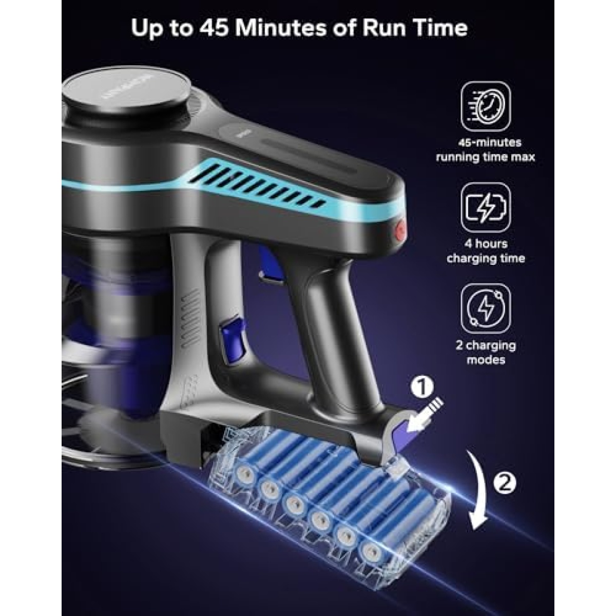 ✅[Upgraded Battery Long Runtime] H18 cordless Stick vacuum has a 2200mAh rechargeable battery, 4H fast charging, delivers up to 20(Max mode)-45(Eco mode) minutes run time depending on your mode, Ideal for whole house work