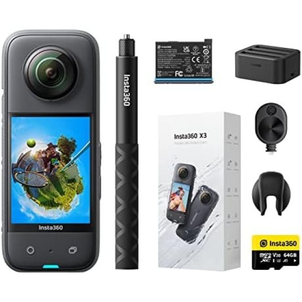 Includes 1x Insta360 X3, 1x 114cm Invisible Selfie Stick, 1x Bike Bundle, 1x 64GB microSD Card and 1x Lens Cap.