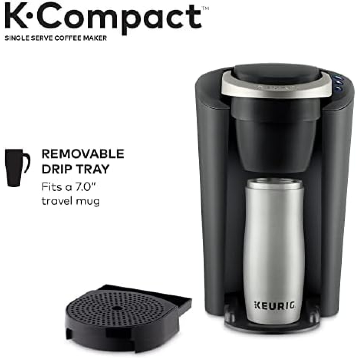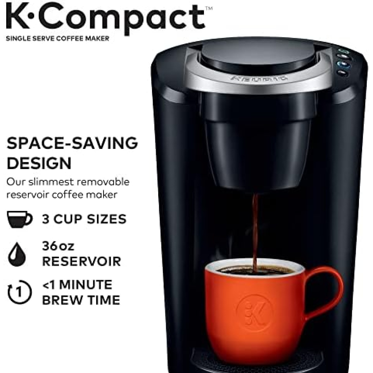 Space saving. Crowd-pleasing. The slender and stylish Keurig K-Compact single serve coffee maker offers consumers a space-saving design to fit their countertop, but still delivers the delicious taste and unparalleled convenience that the Keurig brand is known for. Designed to leave the smallest footprint possible, the Keurig K-Compact brewer in Black is just over 8 inches wide, leaving you plenty of space on your countertop without sacrificing a thing. Brew 6, 8, or 10 oz. of your favorite beverages in under a minute. Choose from hundreds of delicious K-Cup pod varieties coffee, tea, hot cocoa, iced beverages, and more and enjoy a perfect cup, every time. Or brew your own ground coffee with the Keurig Universal My K-Cup Reusable Coffee Filter (not included). The Smart Start feature heats and then brews in one simple process for even more convenience. The K-Compact brewer has a removable drip tray to accommodate travel mugs, and its 36 oz. removable water reservoir allows you to brew multiple cups before refilling.