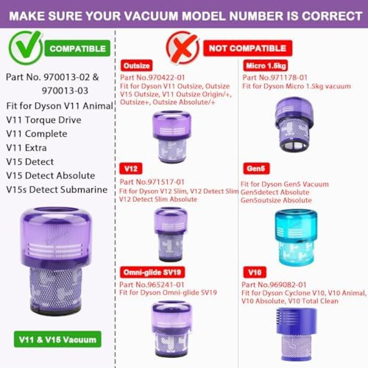 The vacuum filter adopt two-in-one design with H13 efficiency to trap trash ,dirt, dust, pets hair in corners and edges.Premium Quality replacement filter perfectly fit for Dyson V11 V15 cordless stick vacuums.Compatible with Dyson V11 Torque Drive V11 Animal V11 Complete V11 Extra V15 Detect V15s Detect Submarine Vacuums. Compare to part 970013-02 & 970013-03. NOT compatible with Dyson V11 Outsize, V15 Outsize, V11 Outsize Origin, V11 Outsize Origin+, Outsize, Outsize+, Outsize Absolute, Outsize Absolute+, V12 Detect Slim, V12 Slime ,SV12, SV16, SV19 Omni-Glide, Cyclone V10 Animal, V10 Absolute, V10 Cyclone, V10 Total Clean, Micro 1.5kg, Gen5detect Absolute, Gen5outsize Vacuums. Please confirm your accessories model and size before order!NOTE: Any use OEM brand name or model designation is made solely to demonstrate compatibility.