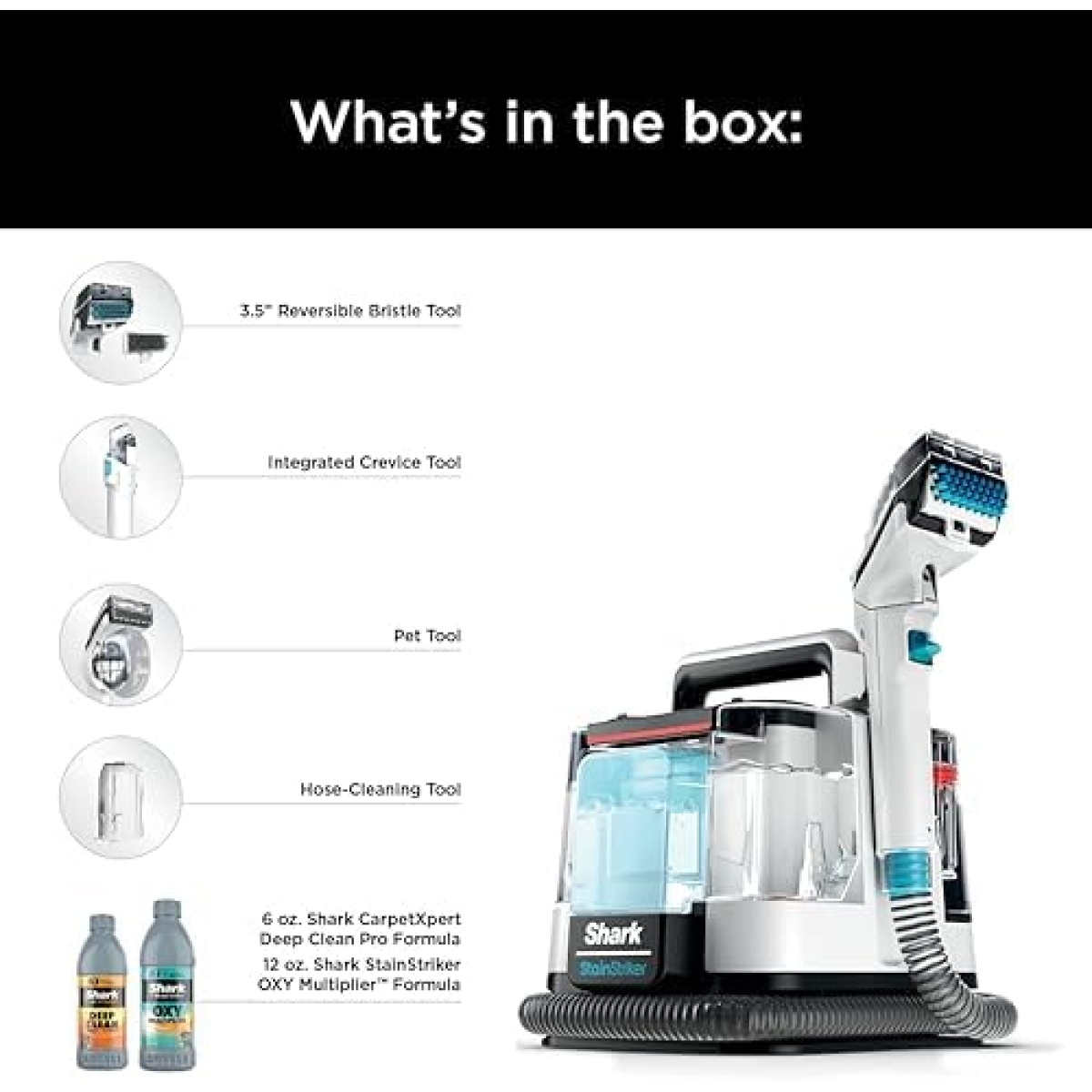 WHAT’S INCLUDED: Shark StainStriker, integrated crevice tool, 3.5″ reversible bristle tool, pet tool, hose clean tool, 6oz Deep Clean Pro Formula, 12oz OXY Multiplier Formula