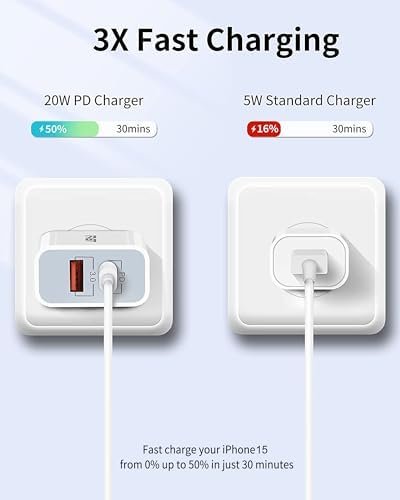 20W Super Fast Charger: USB C charger block equipped with 20W PD 3.0 power delivery output, 3X faster than 5W charger. Charge your phone from 0% to 50% in 30 minutes.