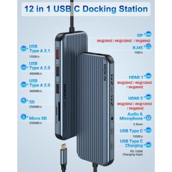 USB C Docking Station for 8K Single Monitor Display, 4K Triple Monitors Display