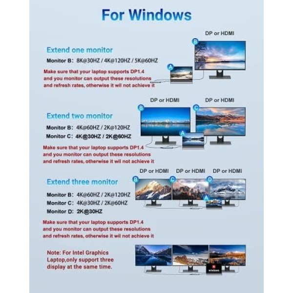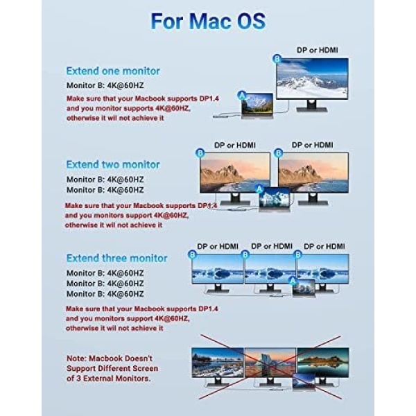 【DOCKING STATION FOR GAMING LAPTOP】This triple monitors USB C hub allows you outputting single 8K@30HZ, 4K@120HZ or 5K@60HZ monitor, 4K@60HZ and 4K@30HZ dual monitor, 4K@60HZ, 4K@30HZ and 2K@60HZ Triple monitor under DP1.4 protocol.(❤️Note: MacOS system, the screens of external monitors are the same, no matter they are displayed in mirror mode or extended mode.)